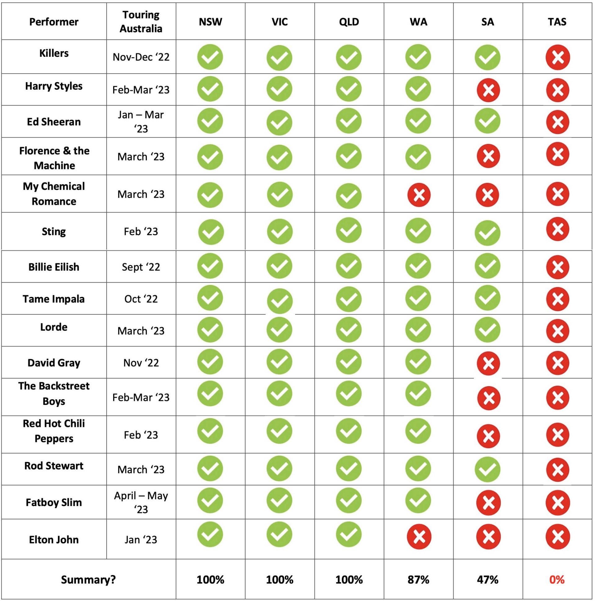 He cited acts such as Ed Sheeran, Harry Styles, Billie Eilish and Elton John as examples of tours that have bypassed the island state.