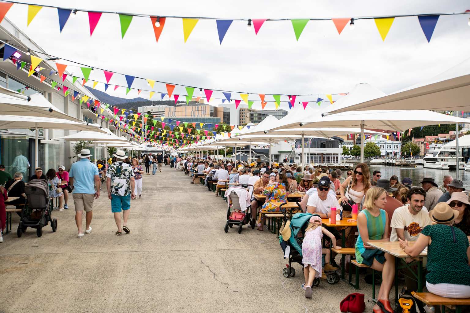 New features this year include a sports garden with a large outdoor screen showing cricket and summer sports, allowing visitors to watch from the Salamanca lawns while enjoying Tasmanian food and drinks.