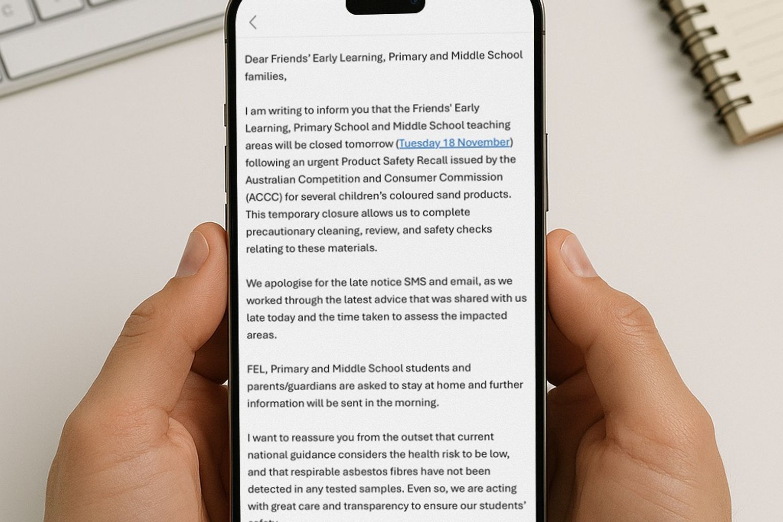 In an email to parents seen by Pulse, Principal Esther Hill reassured families that “current national guidance considers the health risk to be low” and that “respirable asbestos fibres have not been detected in any tested samples”.