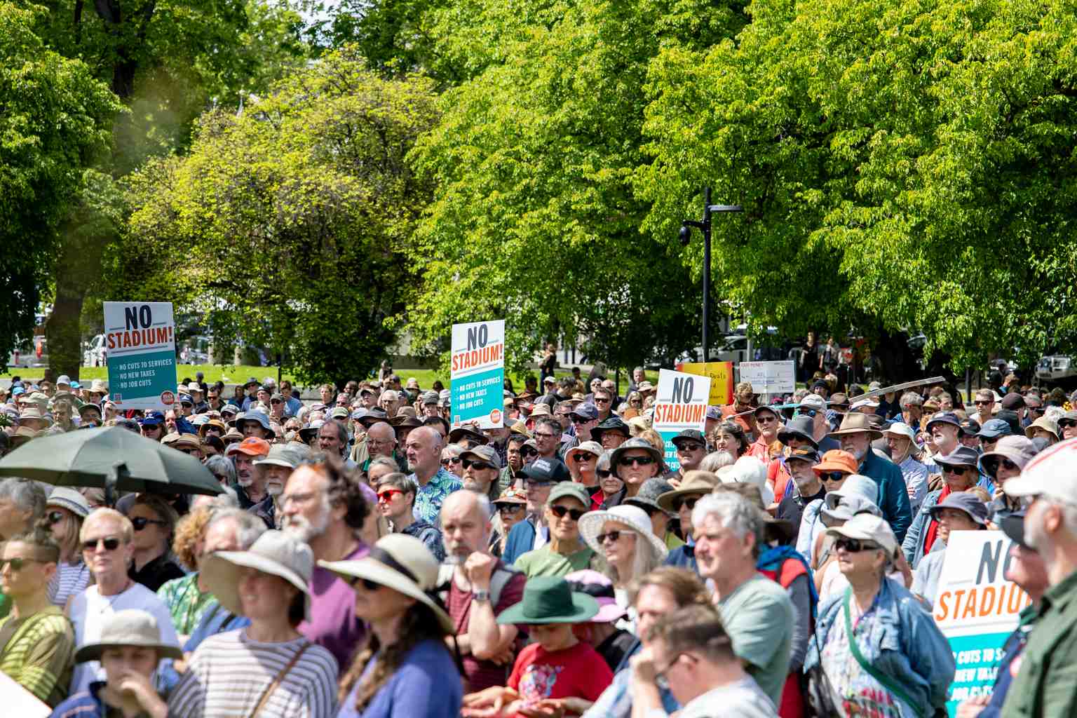 A crowd of Tasmanians gathered on Parliament Lawns in Hobart this morning to oppose the proposed Macquarie Point stadium, as the Legislative Council prepares to vote on the controversial project in early December.