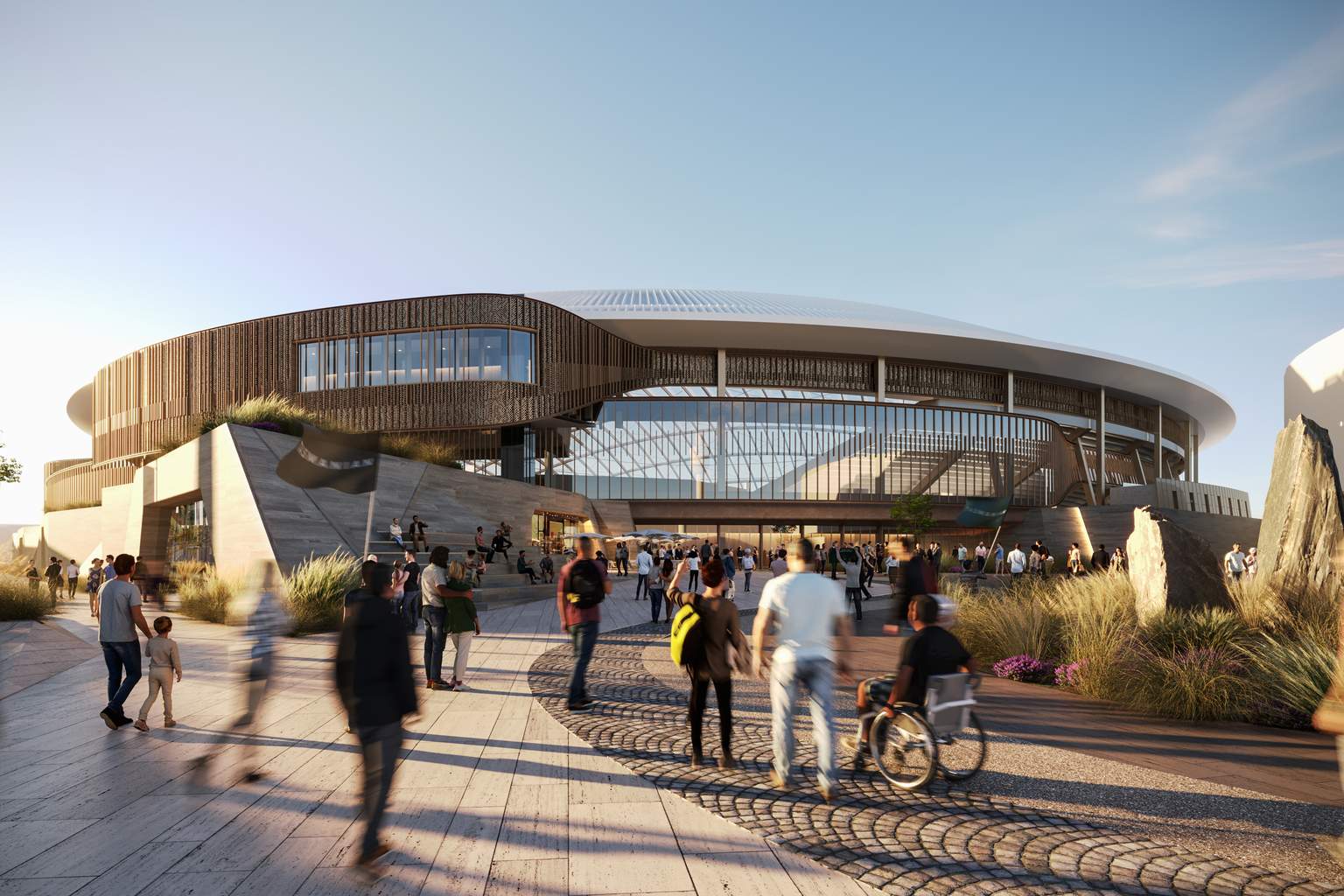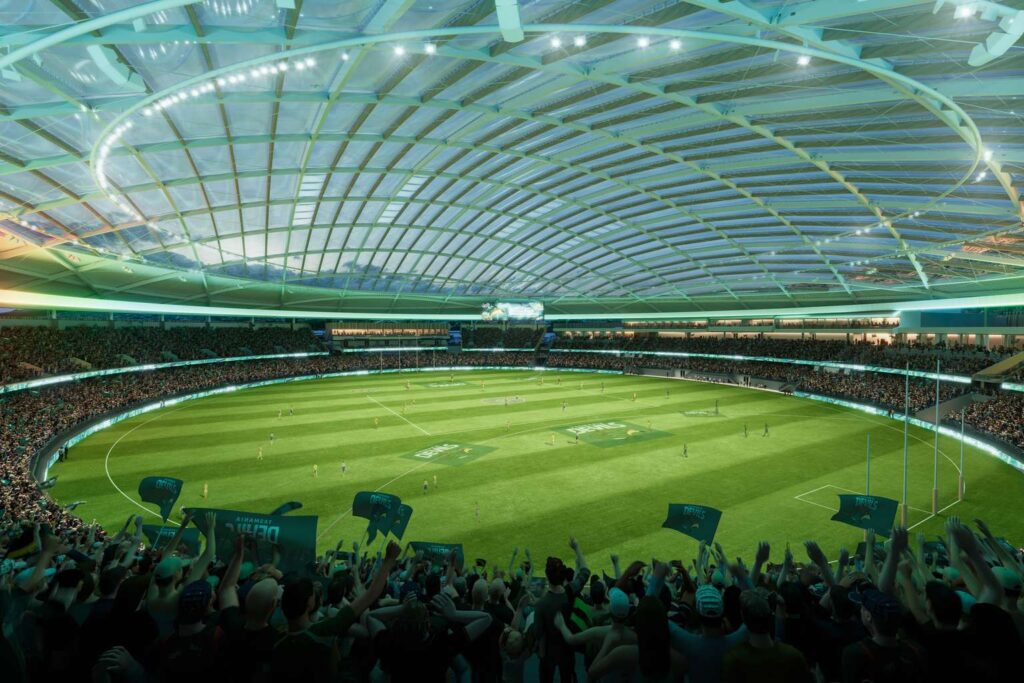 The stadium’s 190-metre clearspan roof would be the world’s largest over a natural grass oval, with its 49-metre internal clearance designed using ball-tracking data to ensure cricket balls won’t strike the roof.