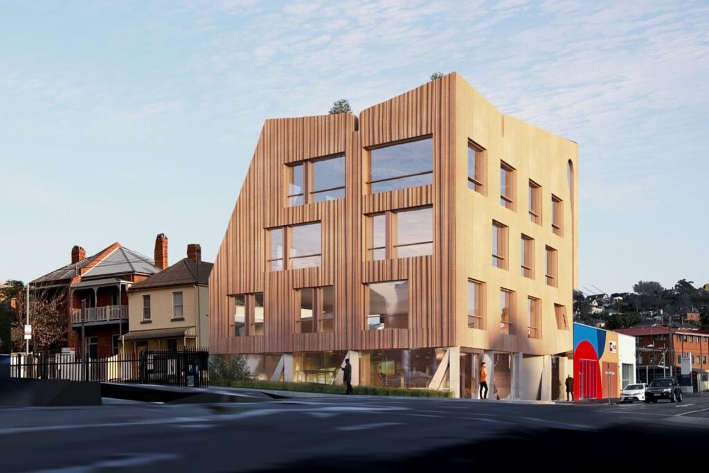 Developed by TasBuild and Goldsworthy Pty Ltd, the proposal includes three floors of office space, a 186-square-metre ground-floor cafe and a rooftop terrace with a meeting room.