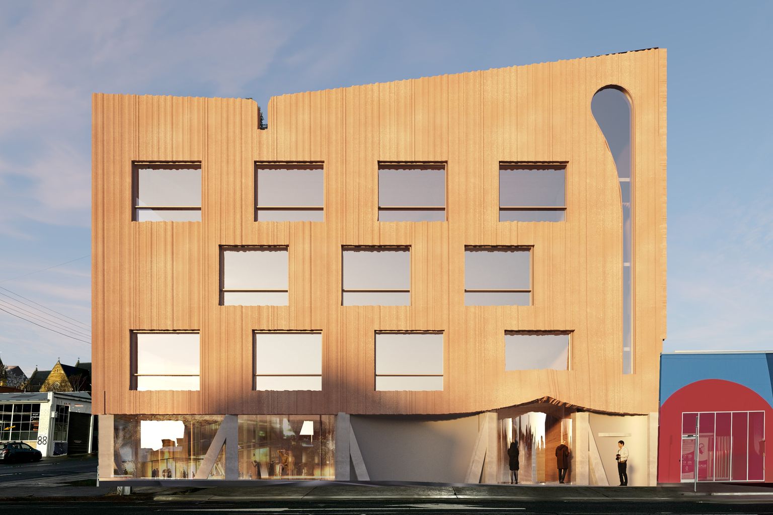 The facade will feature “a red oxide waveform with a sandblasted finish and exposed concrete columns, symbolising people marching with banners”, the application states.